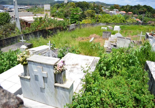 lateral da igreja católica. O mato que tomou conta das sepulturas tem destruído os mausoléus e